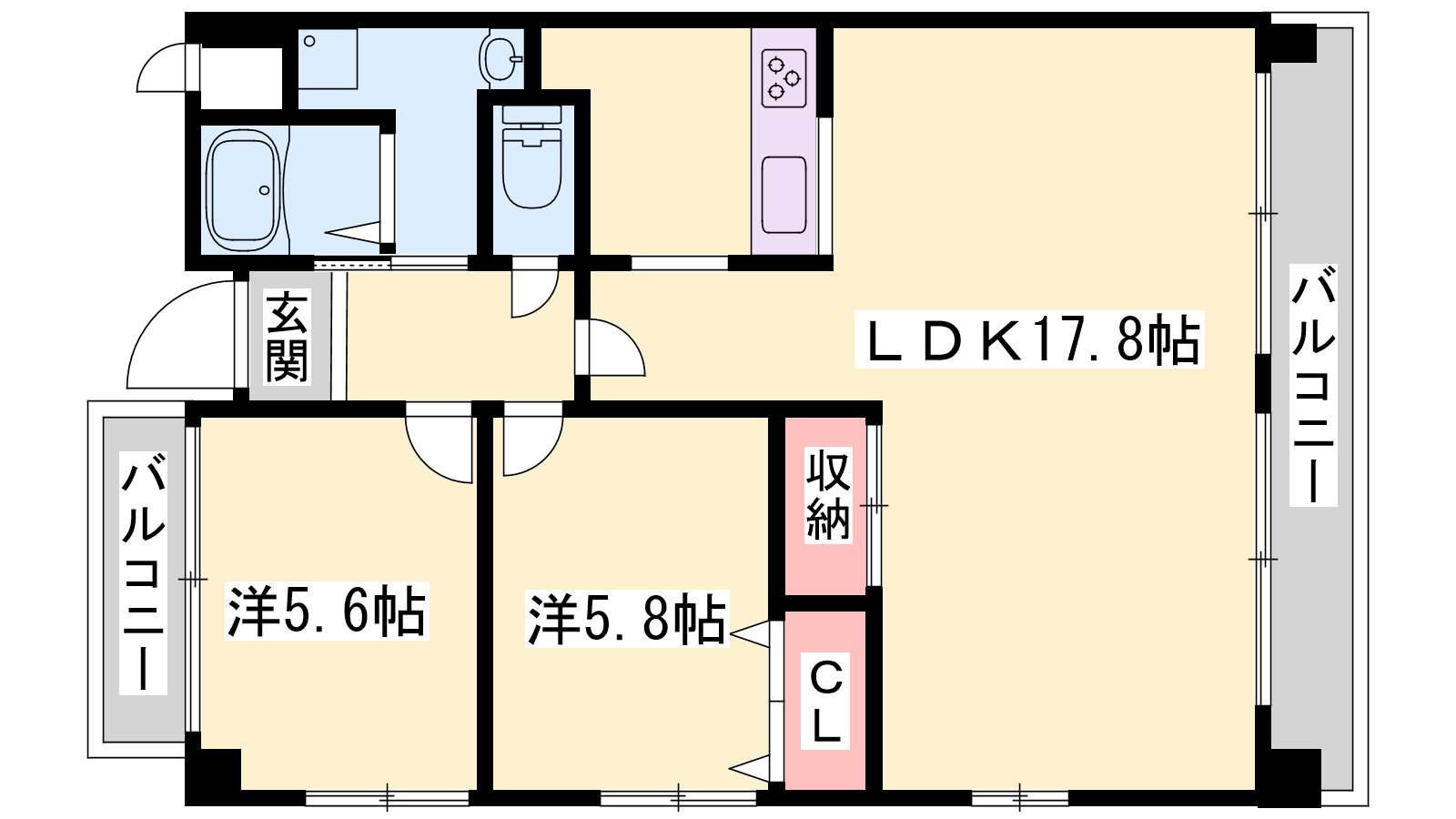 - LDK17.8帖、洋室5.8帖、洋室5.6帖