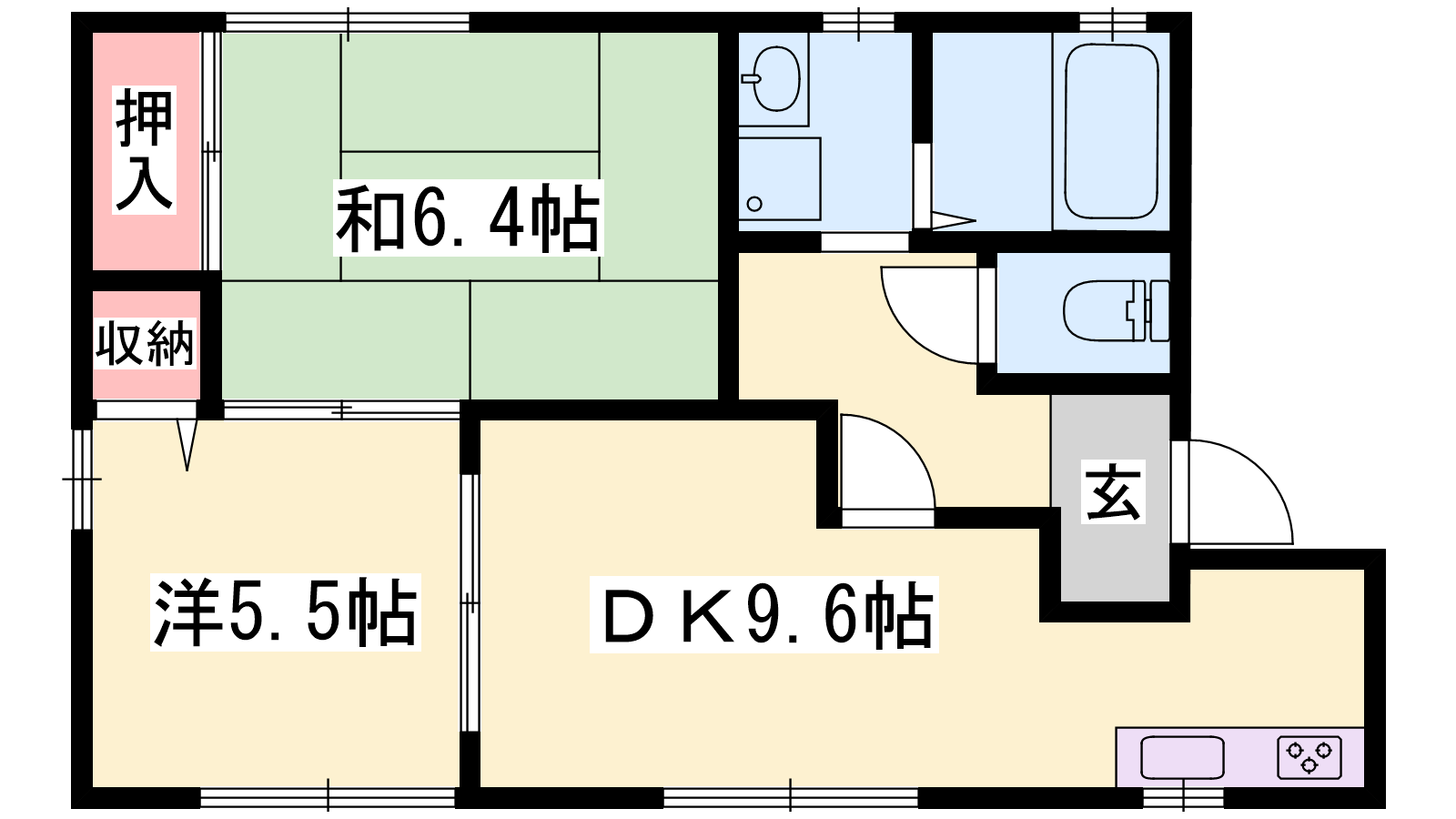 - DK9.6帖、洋室5.5帖、和室6.4帖