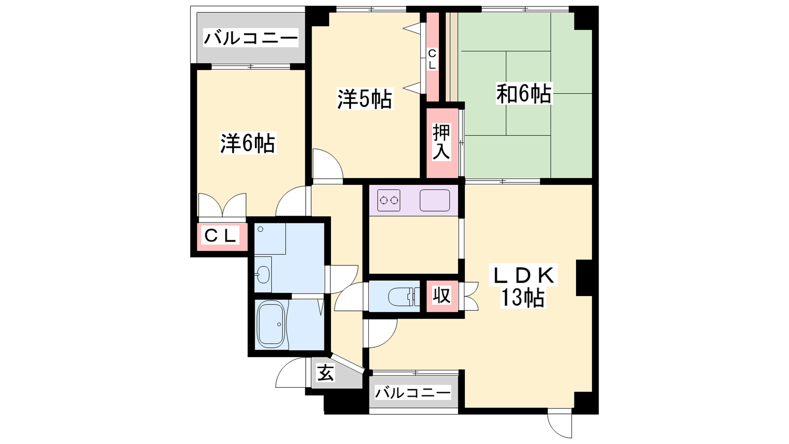 - LDK13帖、洋室6帖、洋室5帖、和室6帖