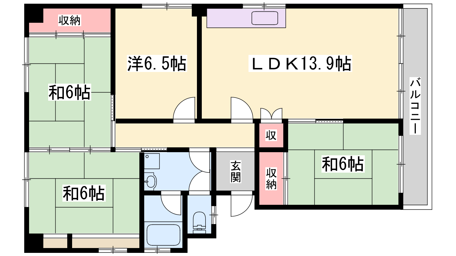 - LDK13.9帖、洋室6.5帖、和室6帖、和室6帖、和室6帖