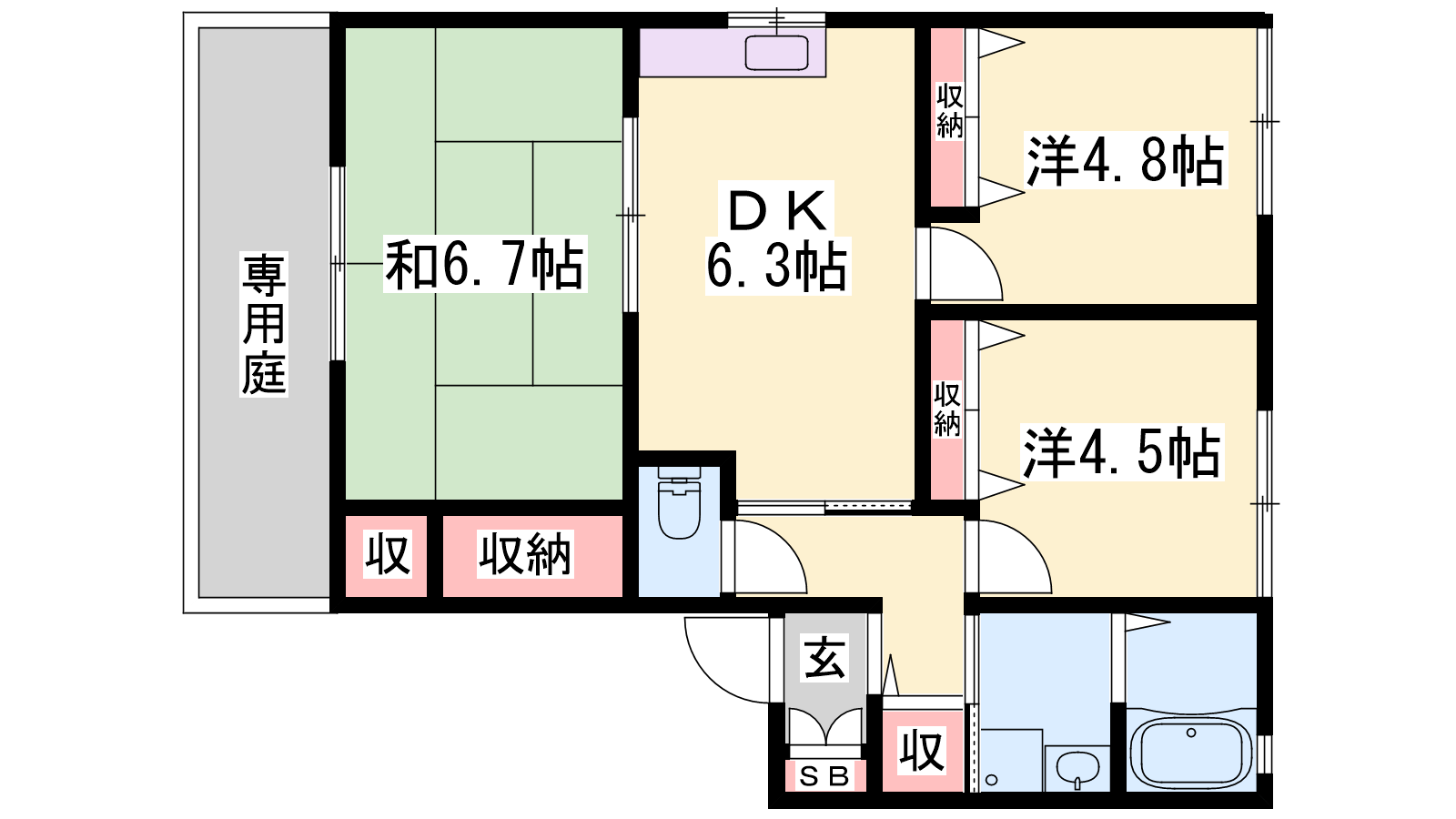 - DK6.3帖、和室6.7帖、洋室4.8帖、洋室4.5帖