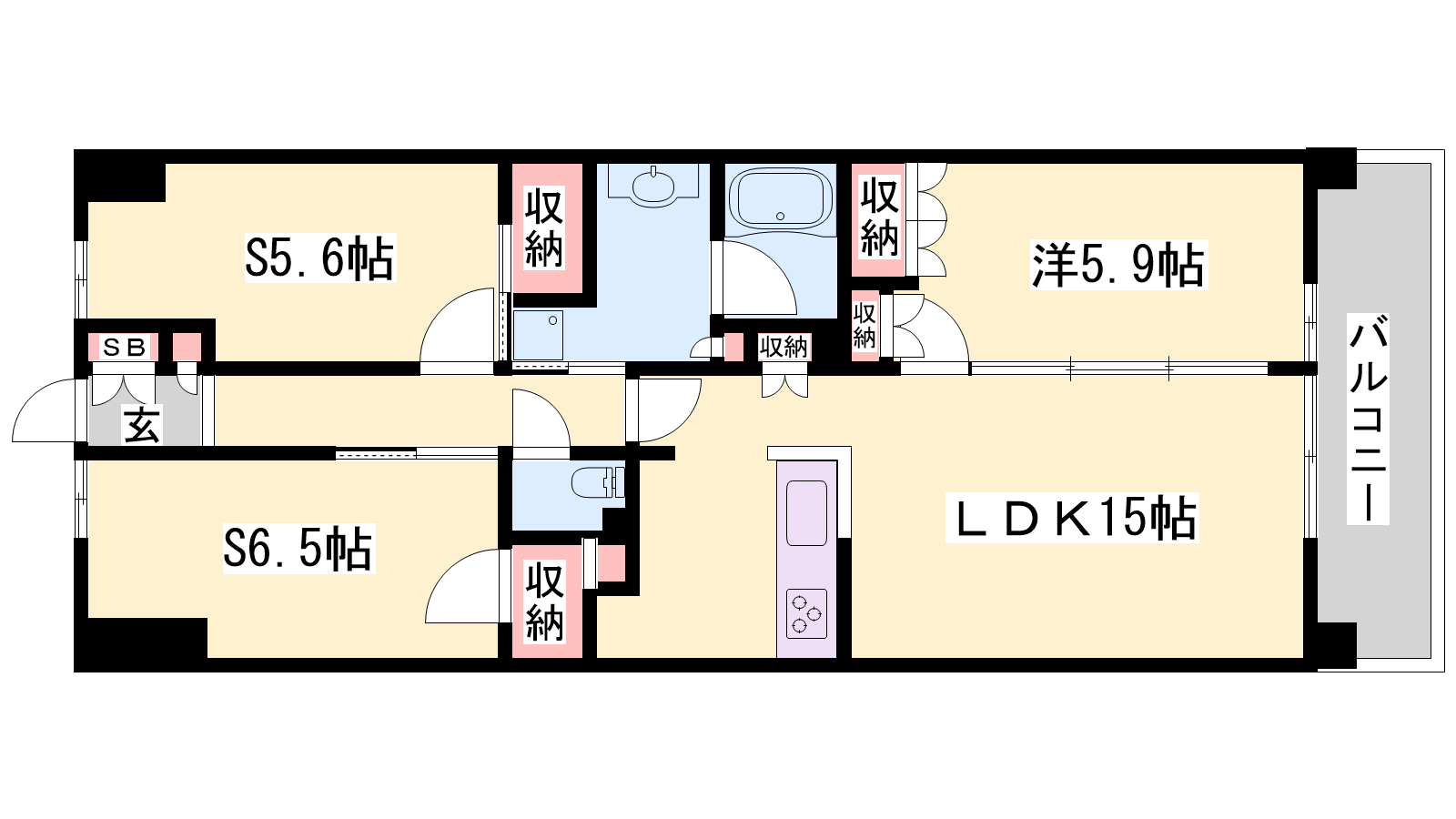 - LDK15帖、洋室5.9帖、S6.5帖、S5.6帖
