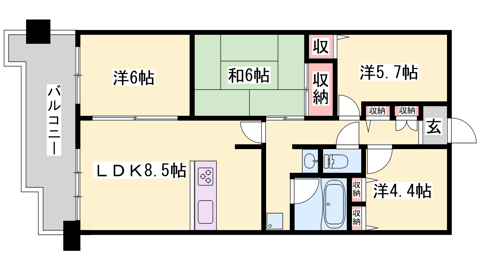 - LDK8.5帖、洋室4.4帖、洋室5.7帖、洋室6帖、和室6帖
