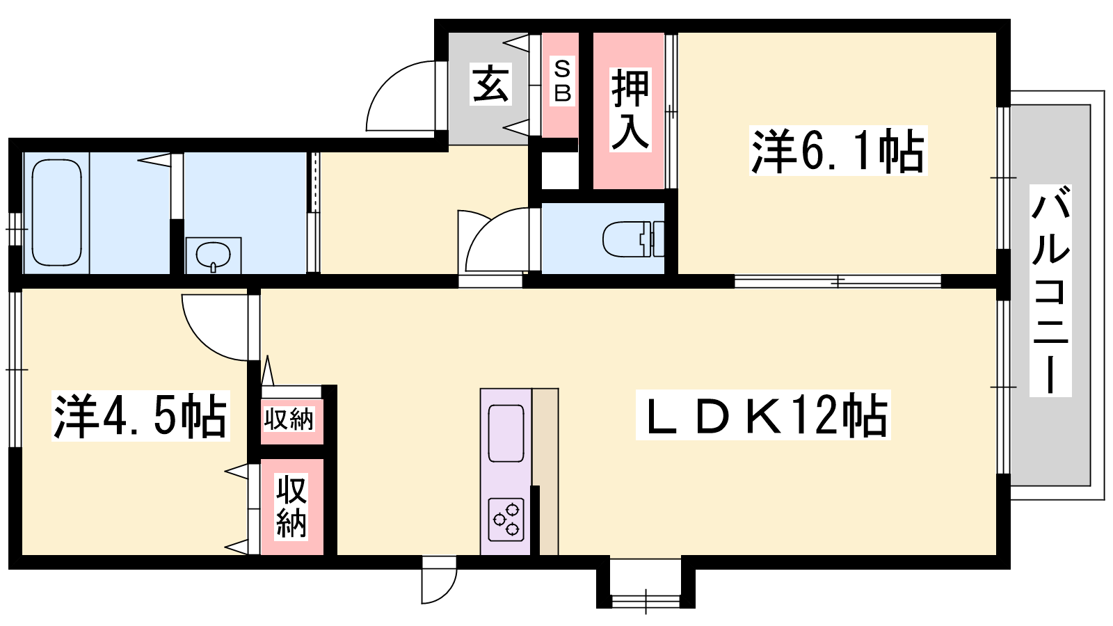 - LDK12帖、洋室4.5帖、洋室6.1帖