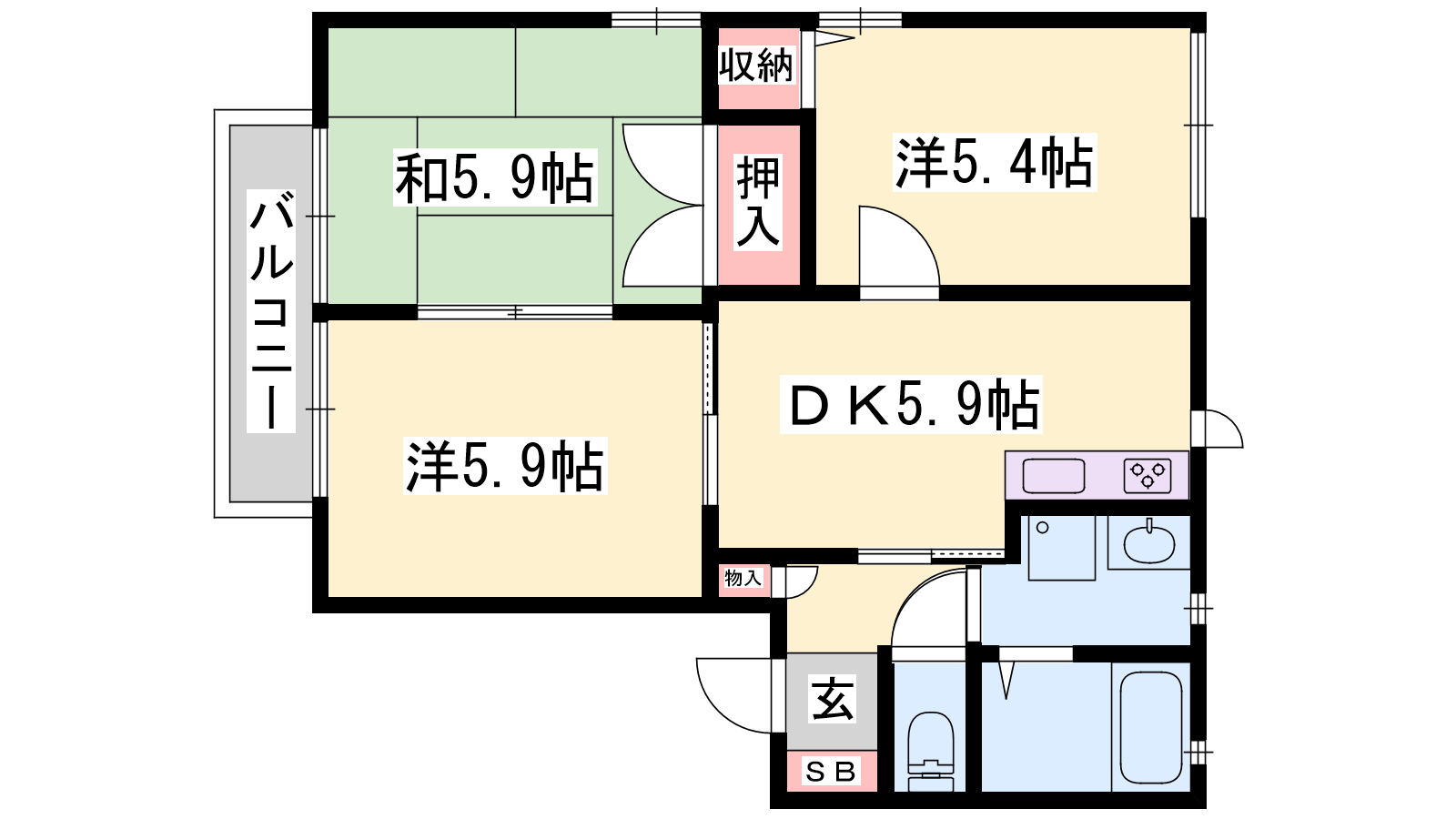 - K5.9帖、洋室5.4帖、洋室5.9帖、和室5.9帖