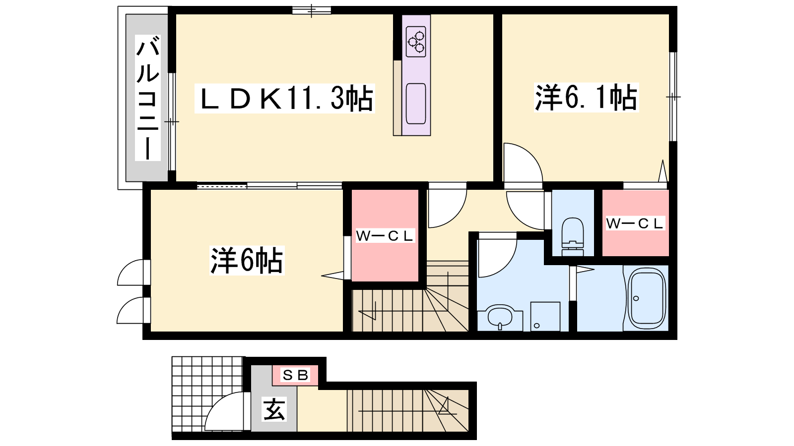 - LDK11.3帖、洋室6.1帖、洋室6帖