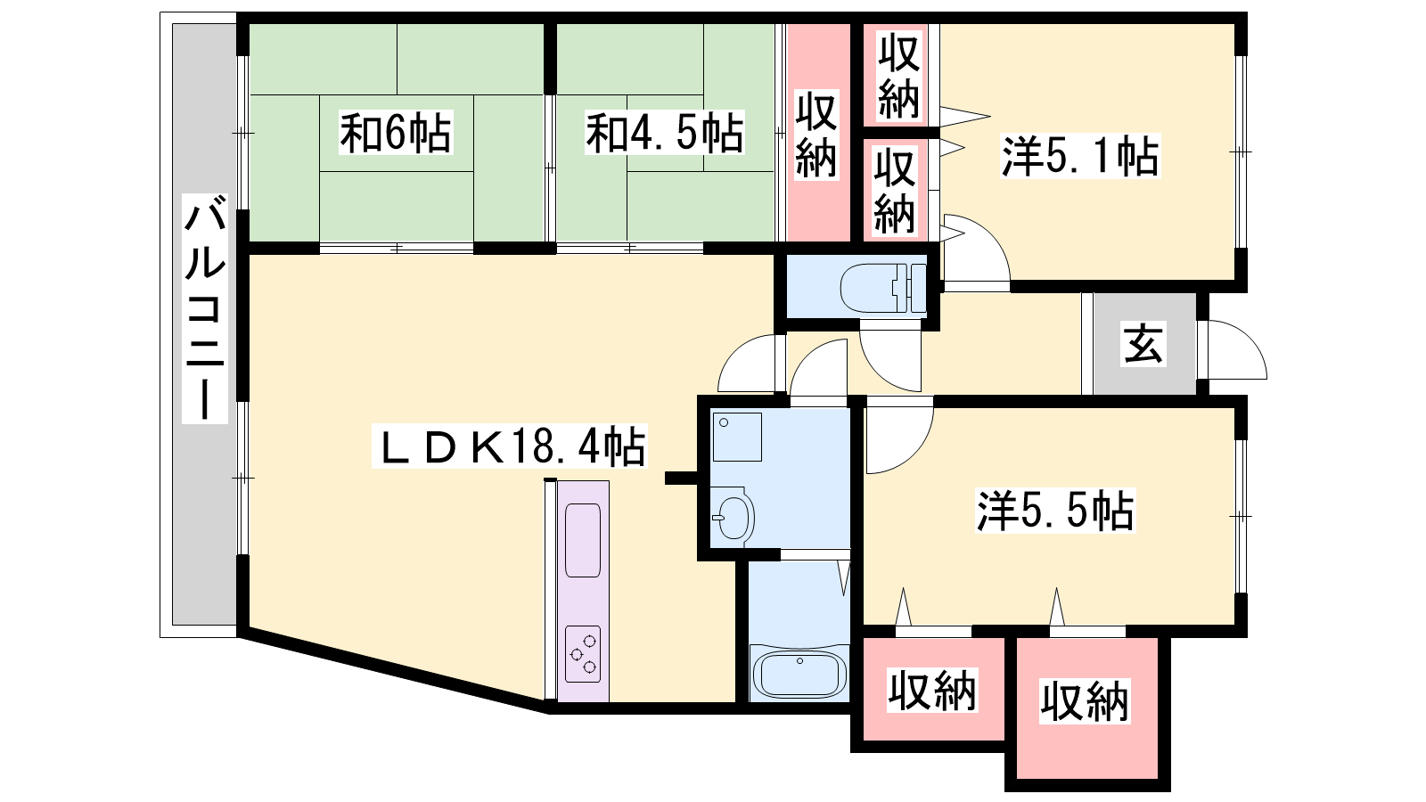 - LDK18.4帖、洋室5.5帖、洋室5.1帖、和室4.5帖、和室6帖