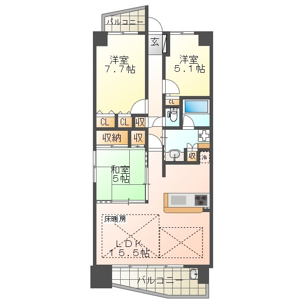 - LDK15.5帖、洋室7.7帖、洋室5.1帖、和室5帖