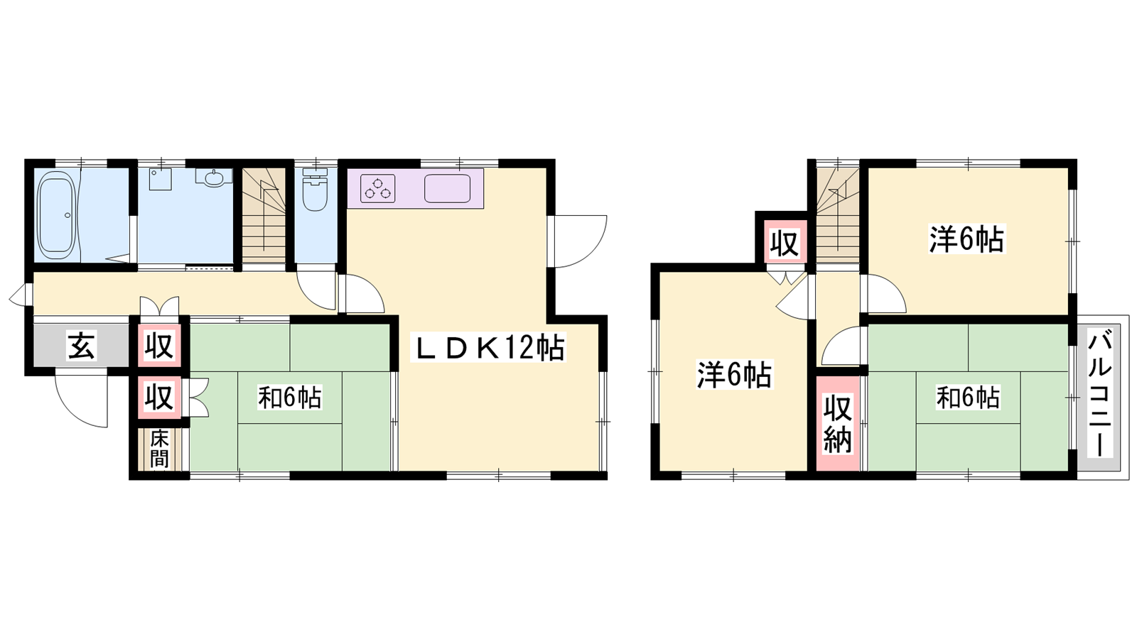 - LDK12帖、洋室6帖、洋室6帖、和室6帖、和室6帖