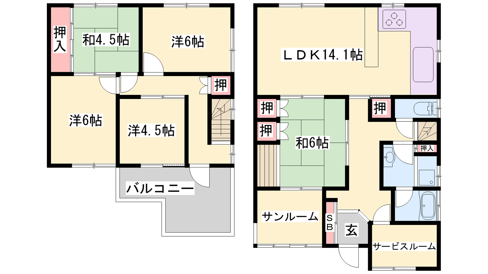 - LDK14.1帖、洋室4.5帖、洋室6帖、洋室6帖、和室4.5帖、和室6帖