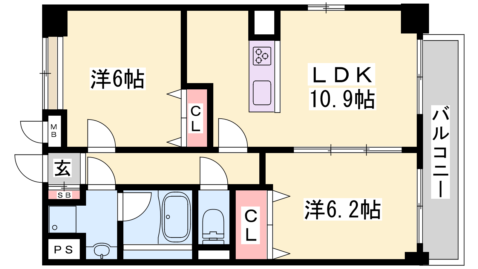 - LDK10.9帖、洋室6.2帖、洋室6帖