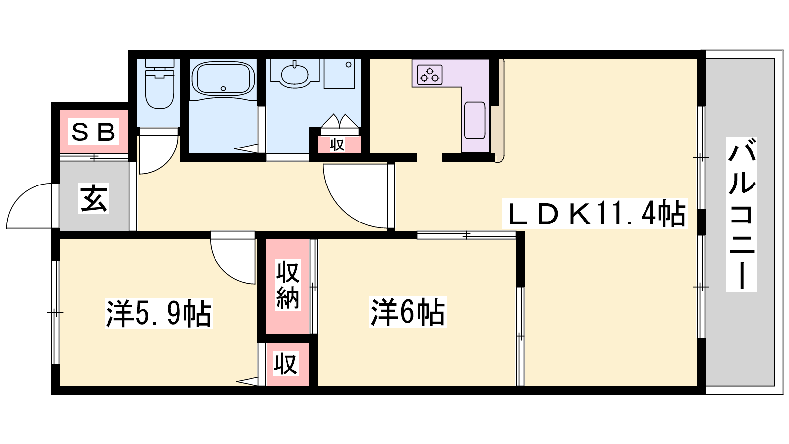 - LDK11.4帖、洋室6帖、洋室5.9帖