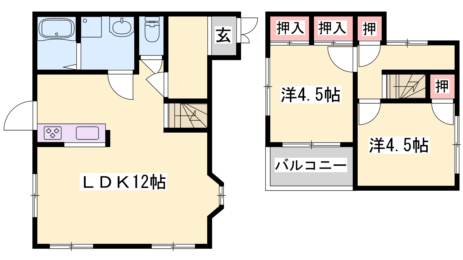 - LDK12帖、洋室4.5帖、洋室4.5帖