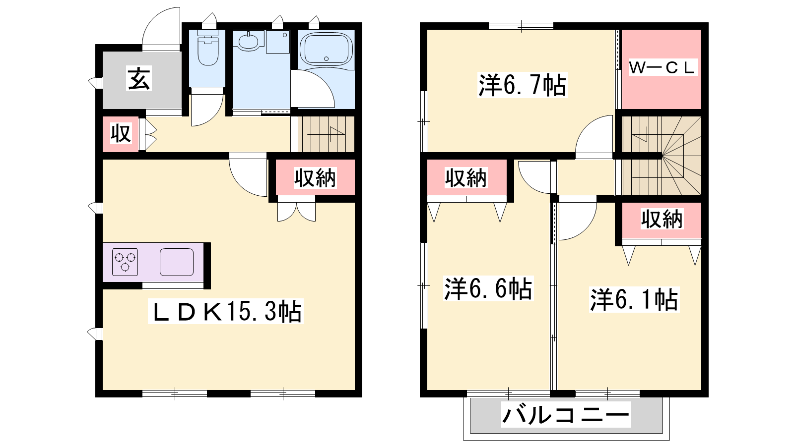 - LDK15.3帖、洋室6.7帖、洋室6.6帖、洋室6.1帖
