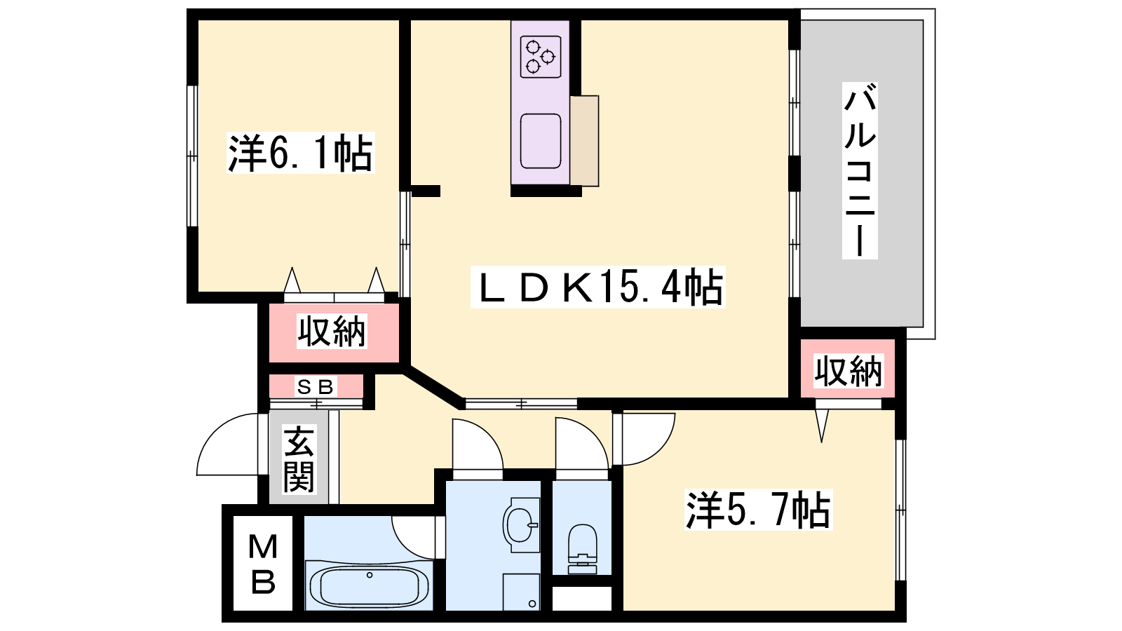 - LDK15.4帖、洋室6.1帖、洋室5.7帖