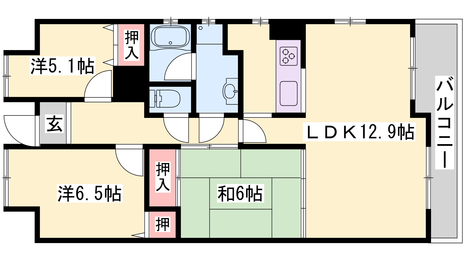 - LDK12.9帖、洋室6.5帖、洋室5.1帖、和室6帖