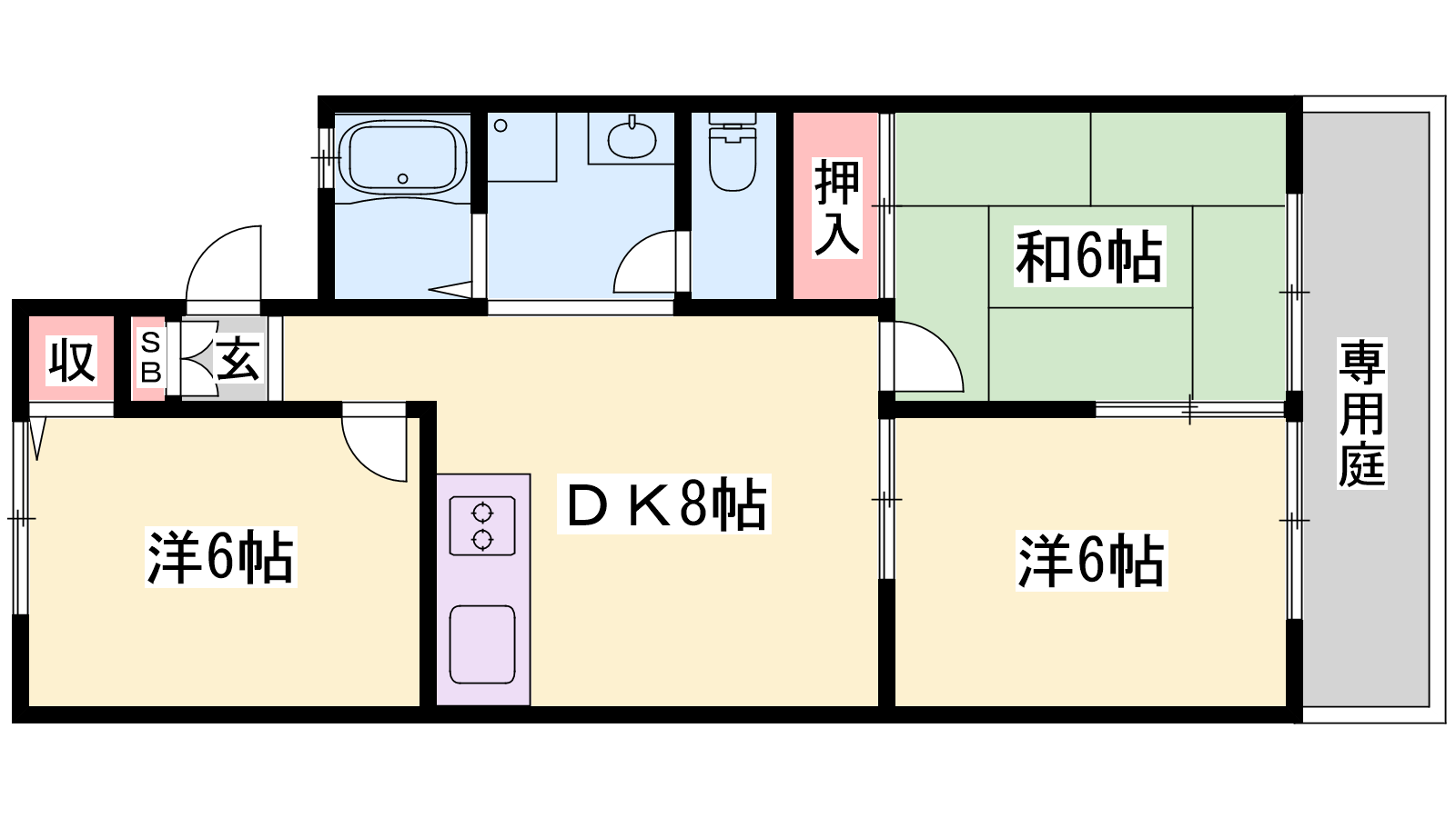 - DK8帖、洋室6帖、洋室6帖、和室6帖