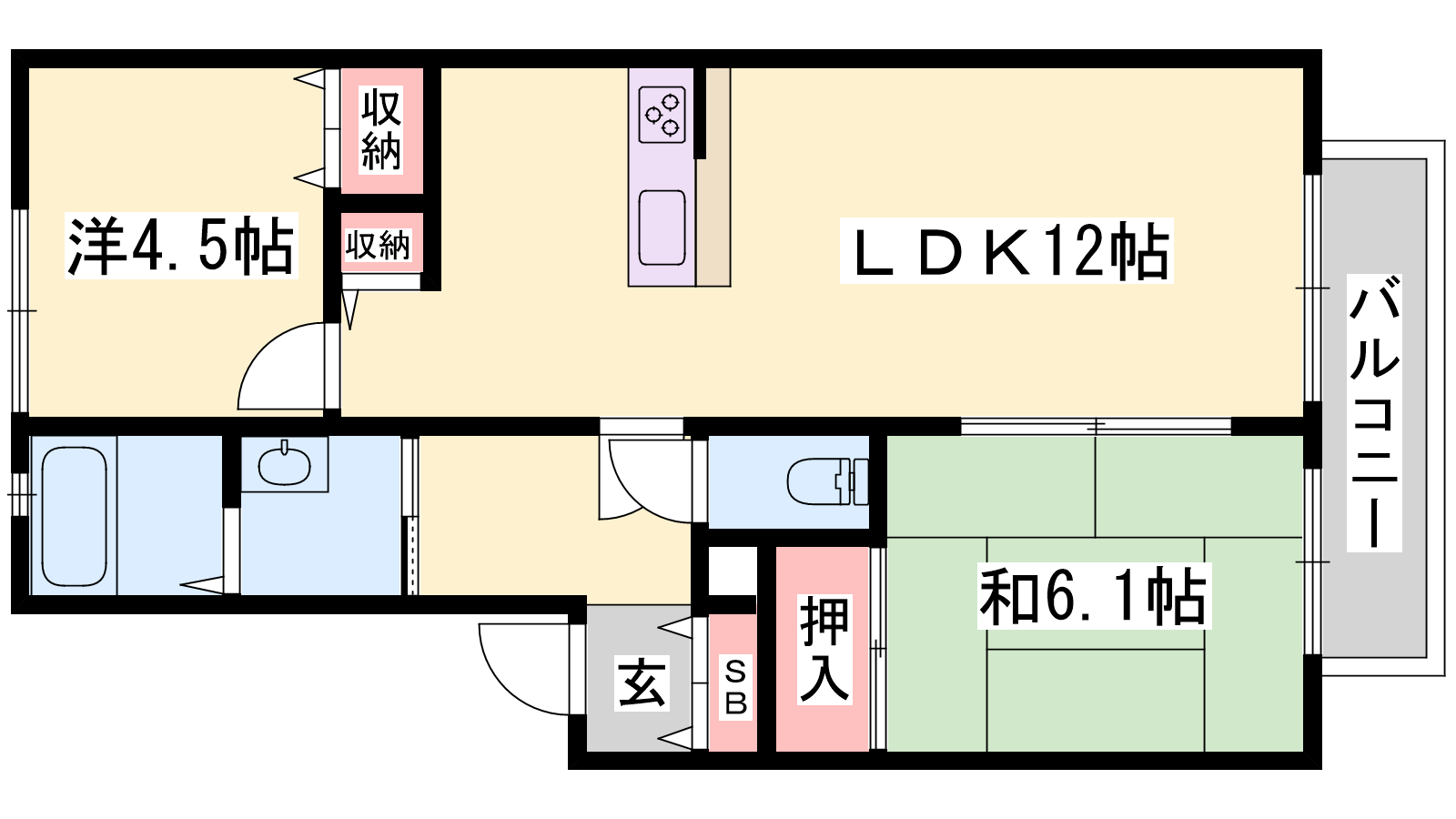 - LDK12帖、洋室4.5帖、和室6.1帖
