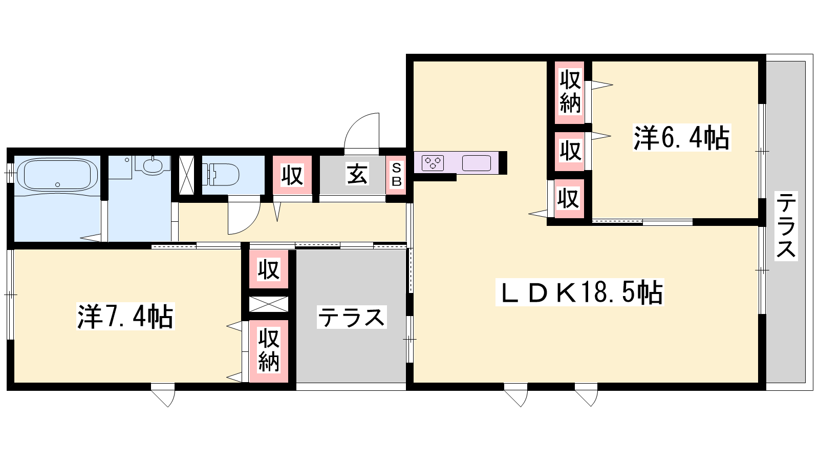 - LDK18.5帖、洋室7.4帖、洋室6.4帖