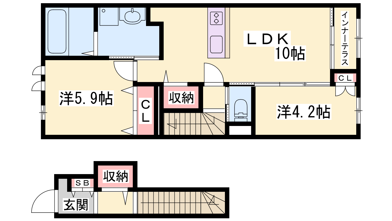 - LDK10帖、洋室5.9帖、洋室4.2帖