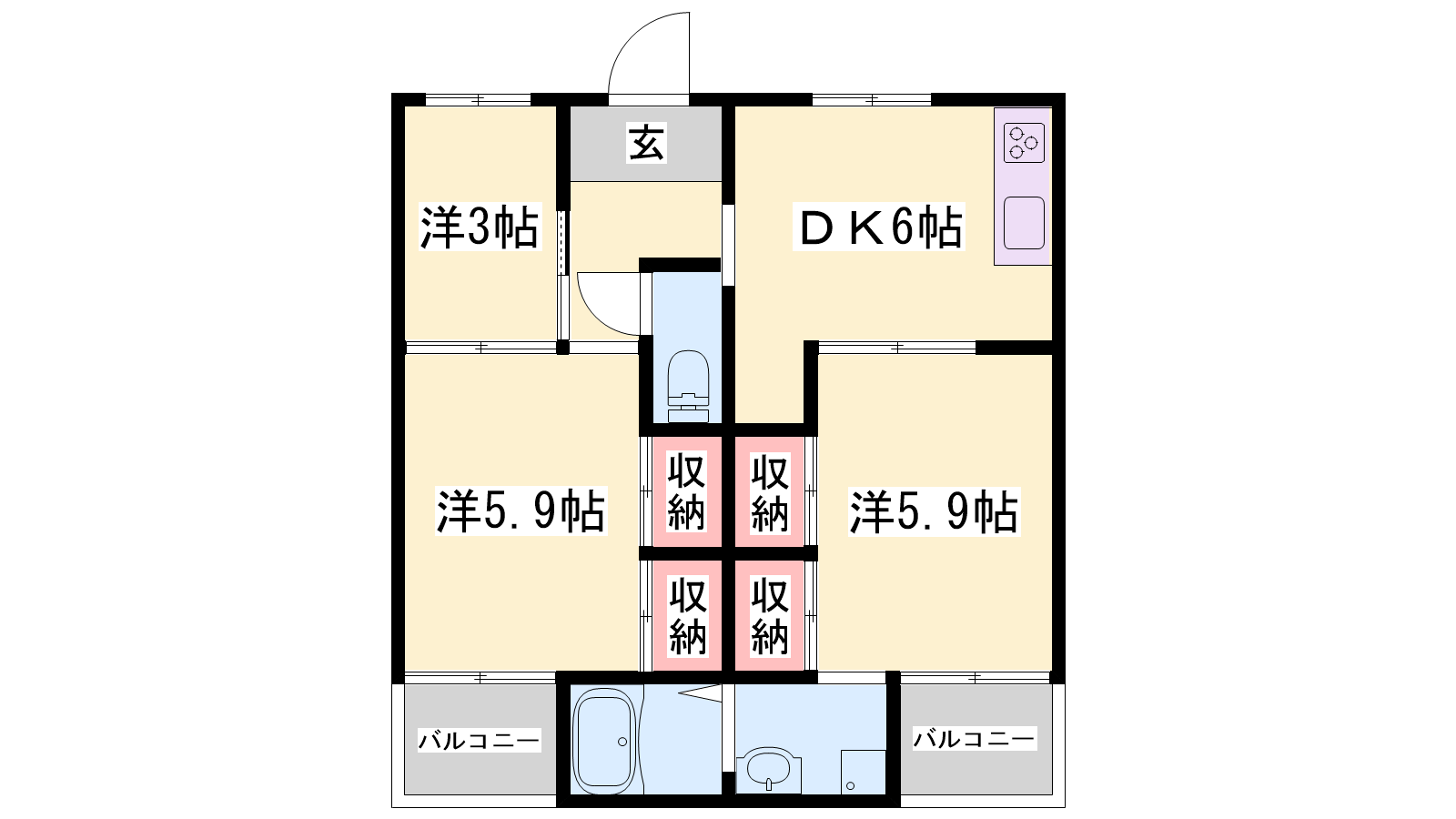 - DK6帖、洋室5.9帖、洋室5.9帖、洋室3帖