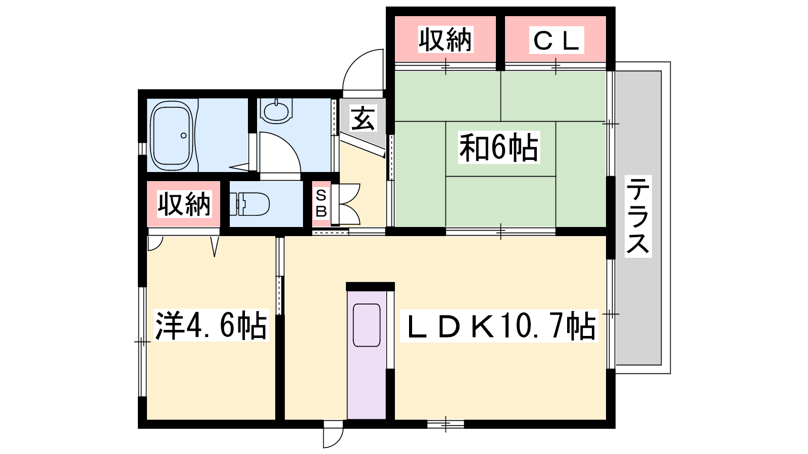 - LDK10.7帖、洋室4.6帖、洋室6帖