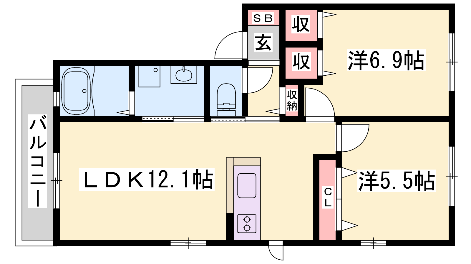 - LDK12.1帖、洋室6.9帖、洋室5.5帖