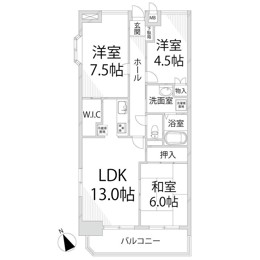 - LDK13帖、洋室7.5帖、洋室4.5帖、和室6帖