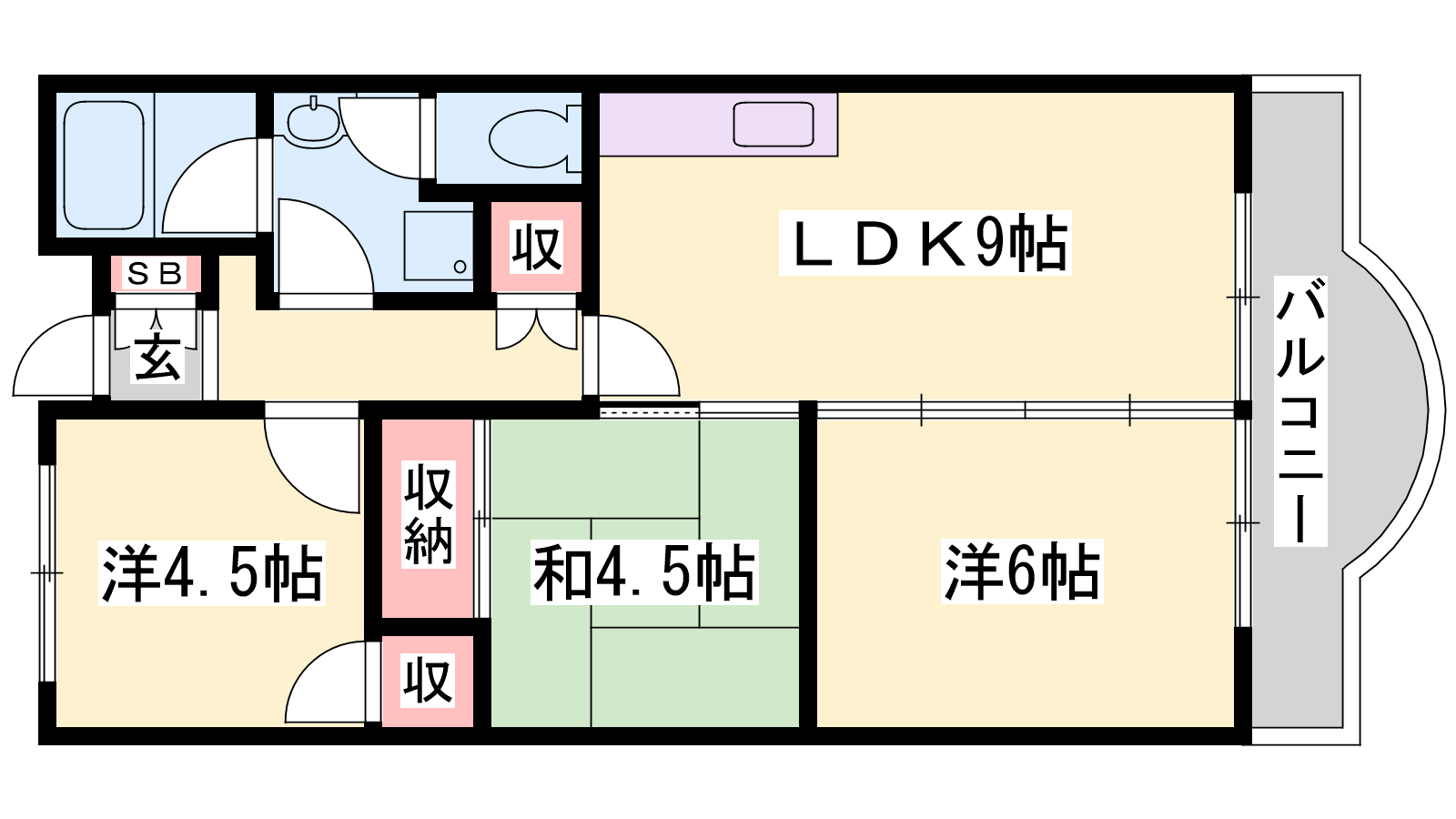 - LDK9帖、洋室6帖、洋室4.5帖、和室4.5帖
