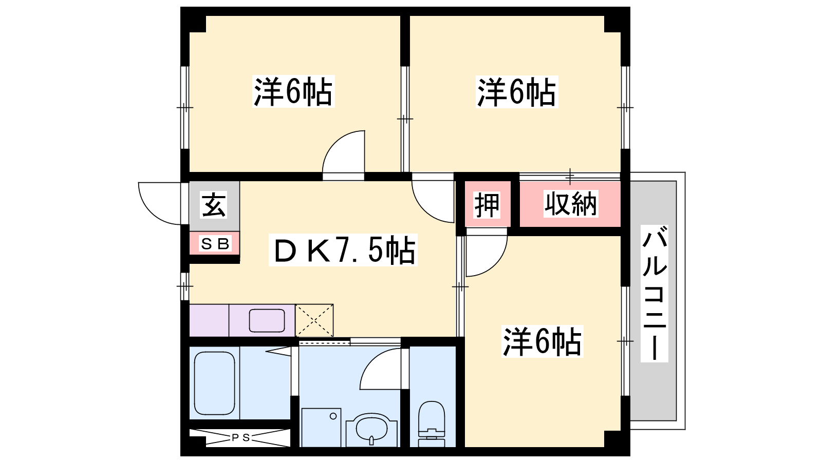 - DK7.5帖、洋室6帖、洋室6帖、洋室6帖