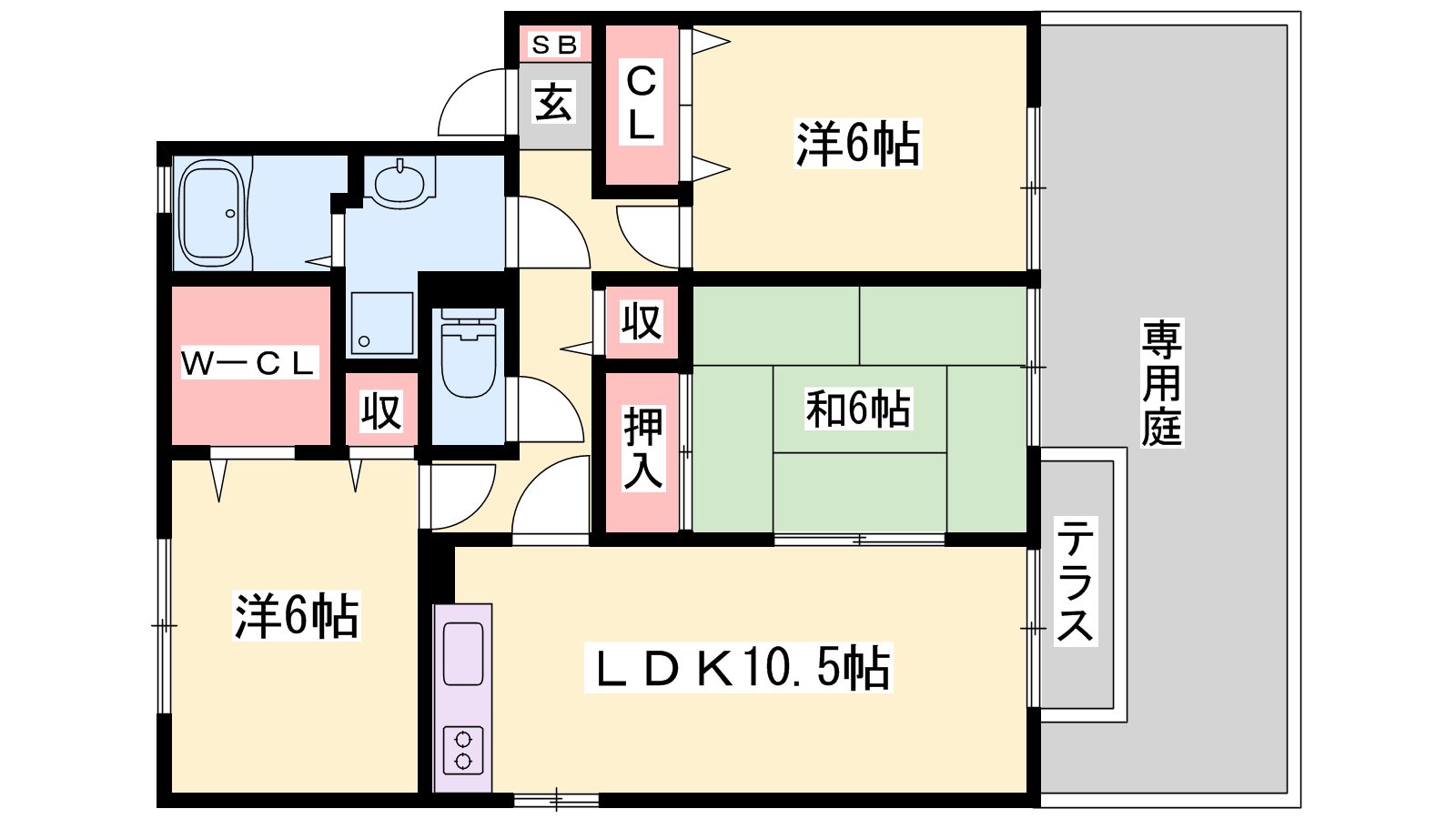 - LDK10.5帖、洋室6帖、洋室6帖、和室6帖