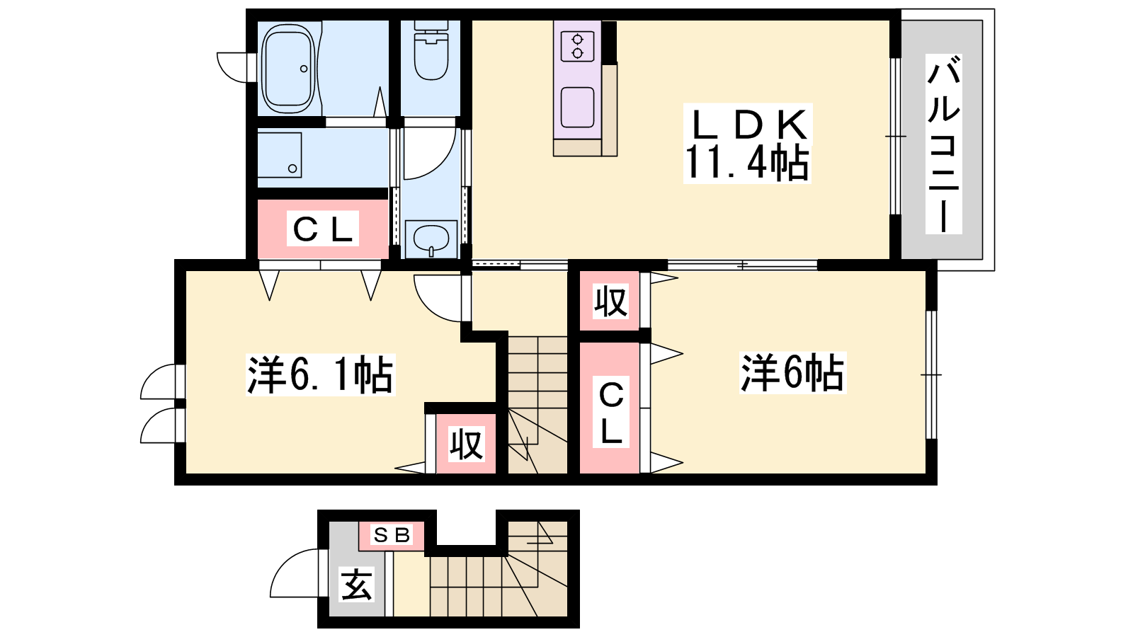 - LDK11.4帖、洋室6.1帖、洋室6帖