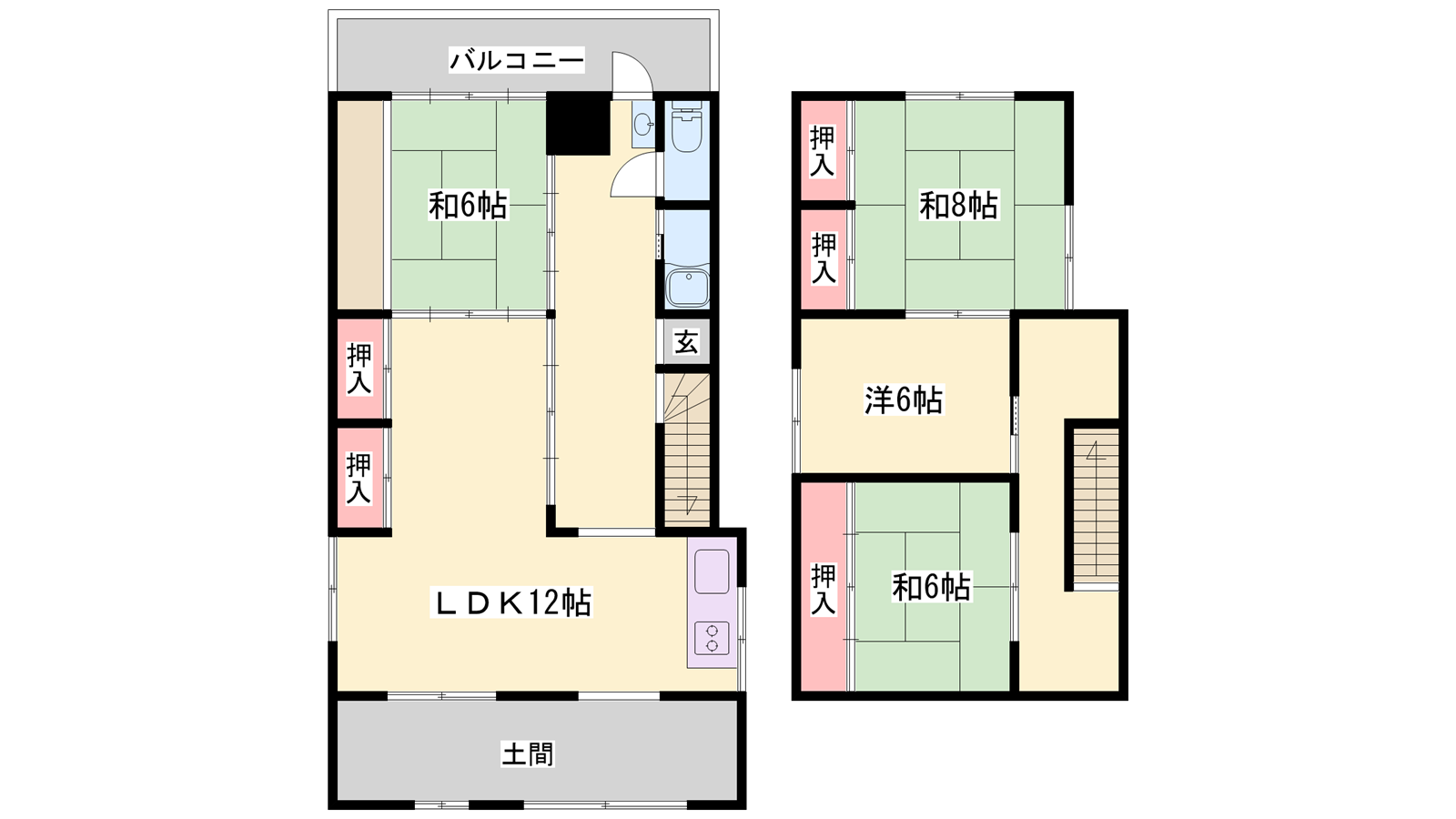 - LDK12帖、洋室6帖、洋室8帖、和室6帖、和室6帖