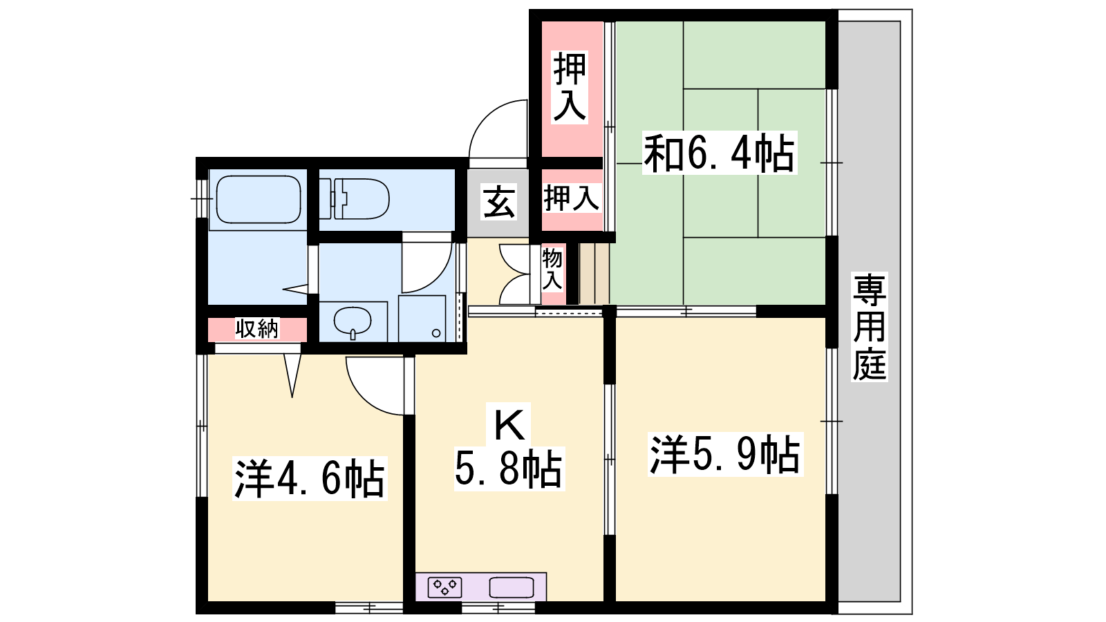 - K5.8帖、和室6.4帖、洋室5.9帖、洋室4.6帖