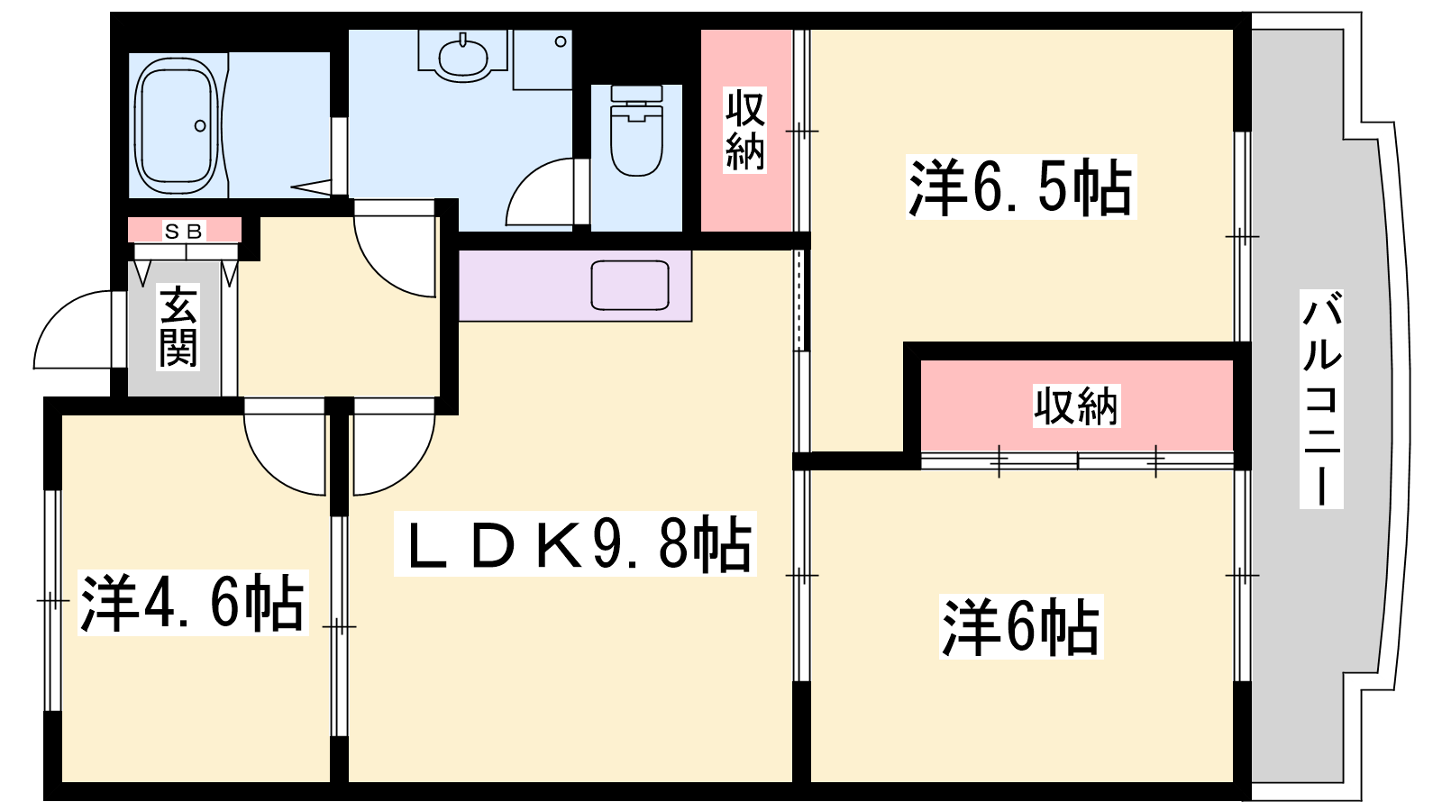 - DK9.8帖、洋室6.5帖、洋室6帖、洋室4.6帖