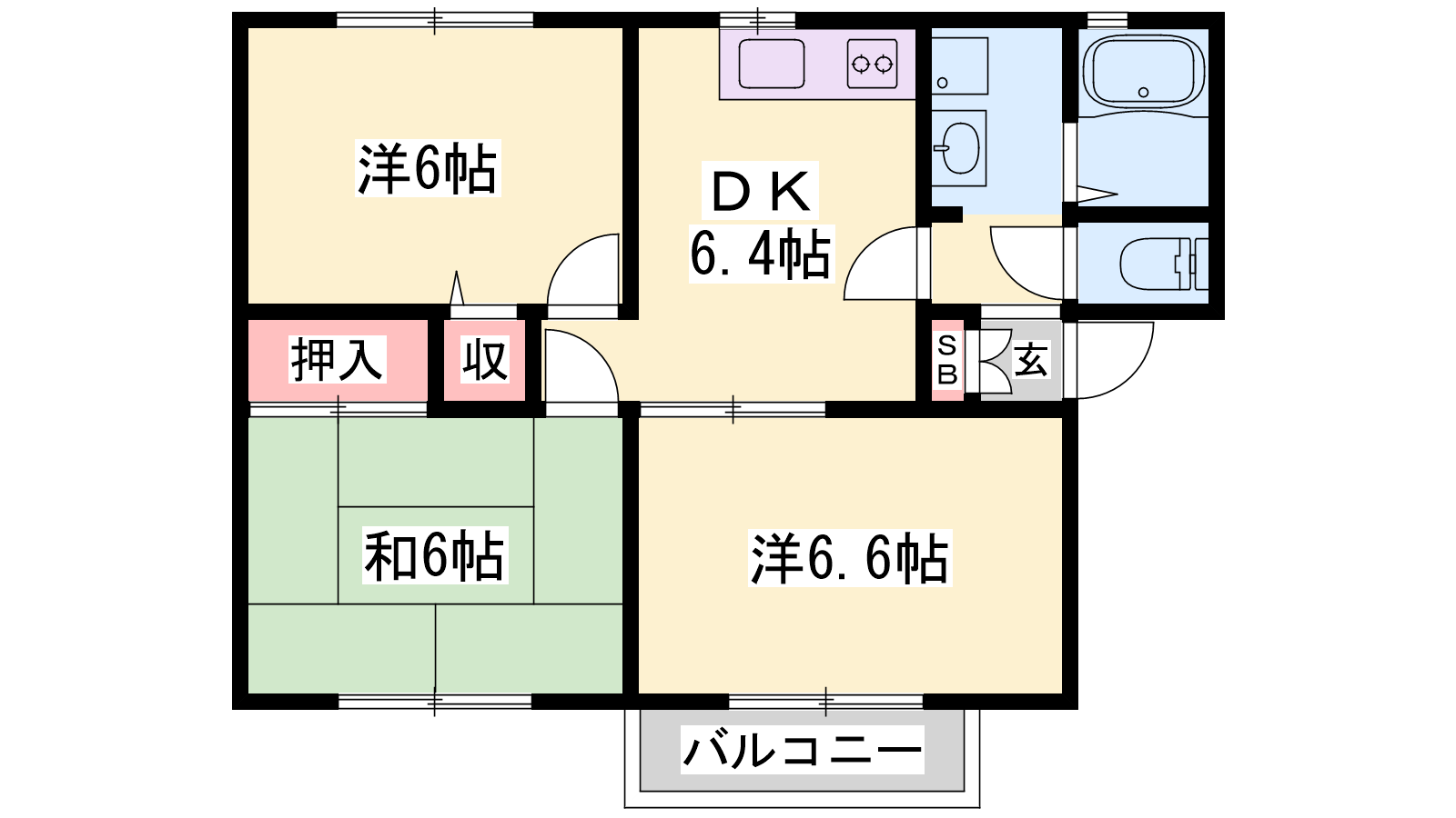 - DK6.4帖、洋室6.6帖、洋室6帖、和室6帖