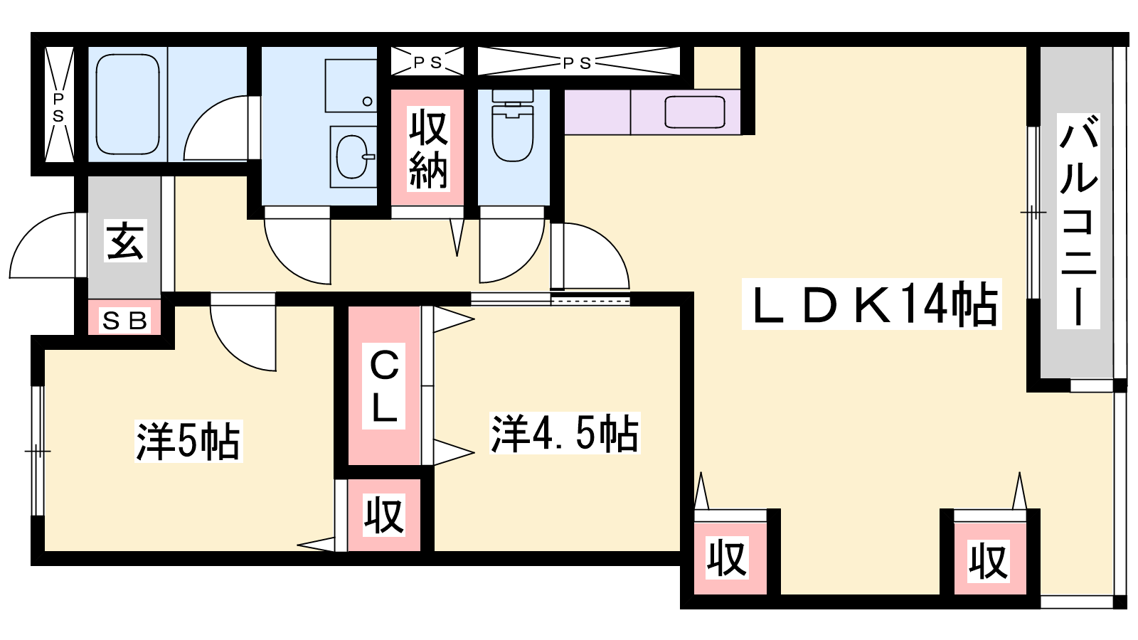 - LDK14帖、洋室5帖、洋室4.5帖