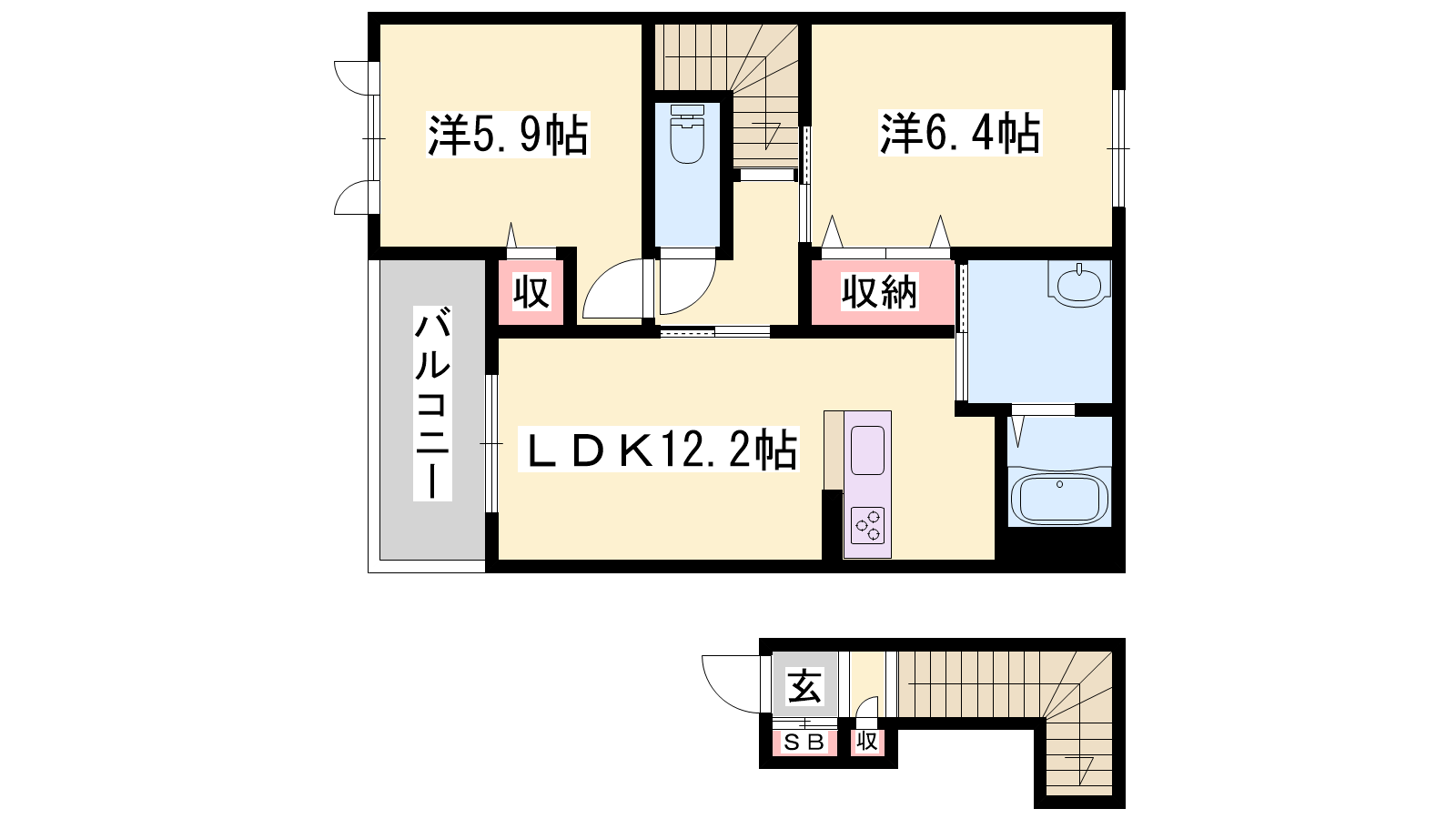 - LDK12.2帖、洋室6.4帖、洋室5.9帖
