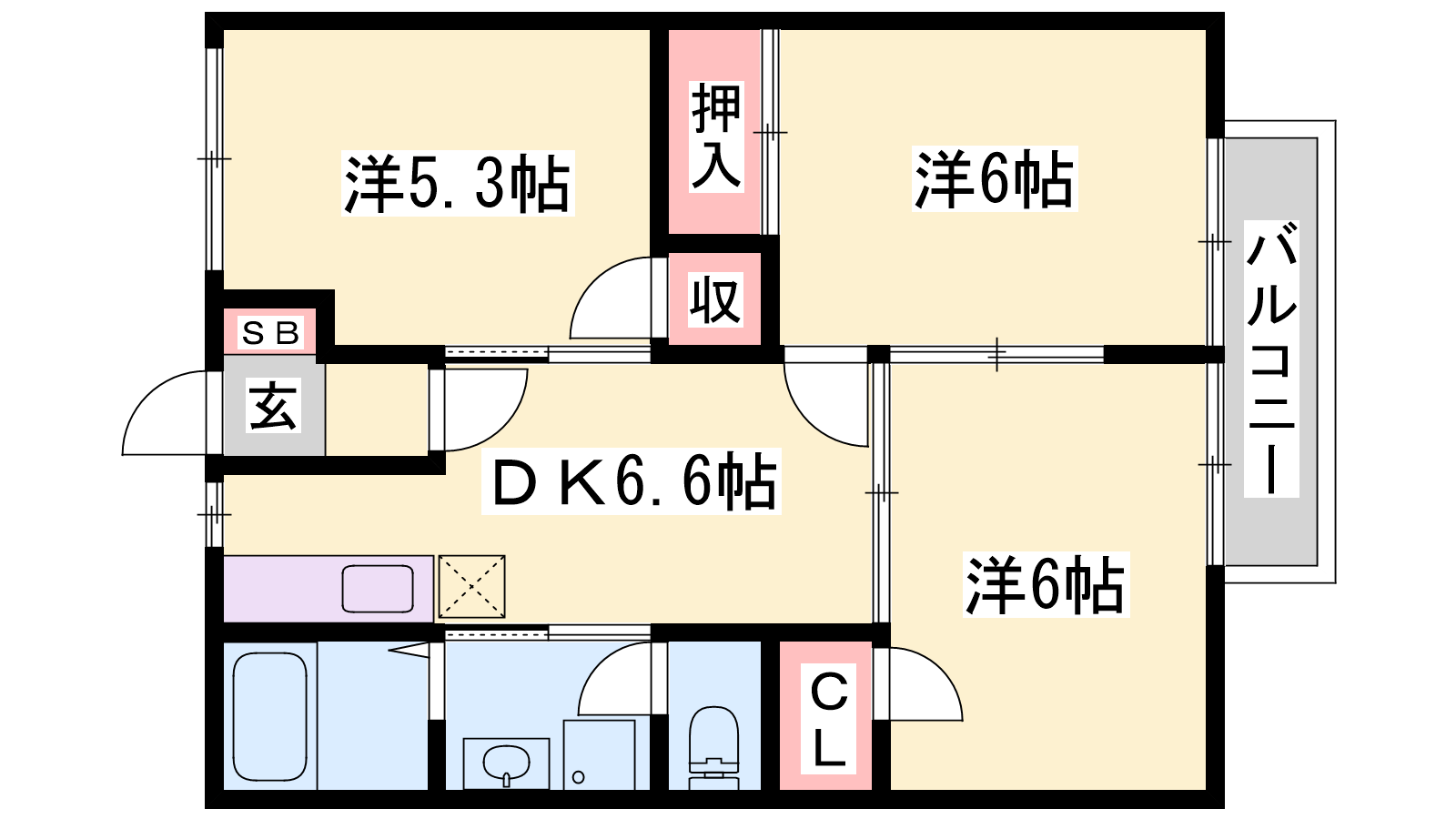 - DK6.6帖、洋室5.3帖、洋室6帖、洋室6帖