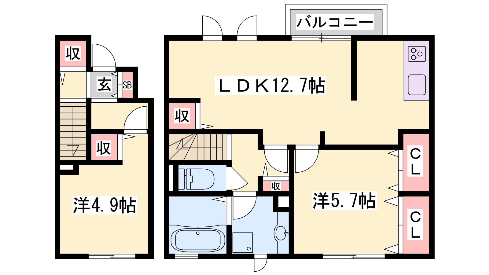 - LDK12.7帖、洋室5.7帖、洋室4.9帖
