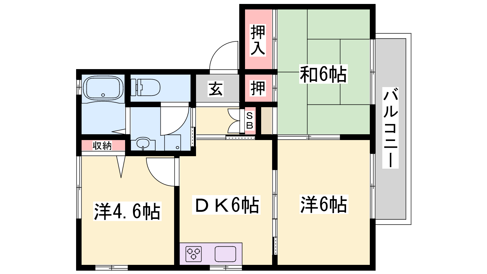 - DK6帖、洋室6帖、洋室4.6帖、和室6帖