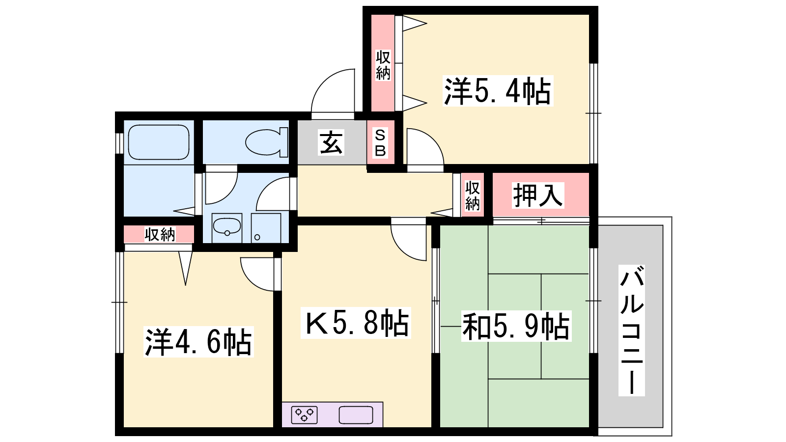 - K5.8帖、洋室5.4帖、洋室4.6帖、和室5.9帖