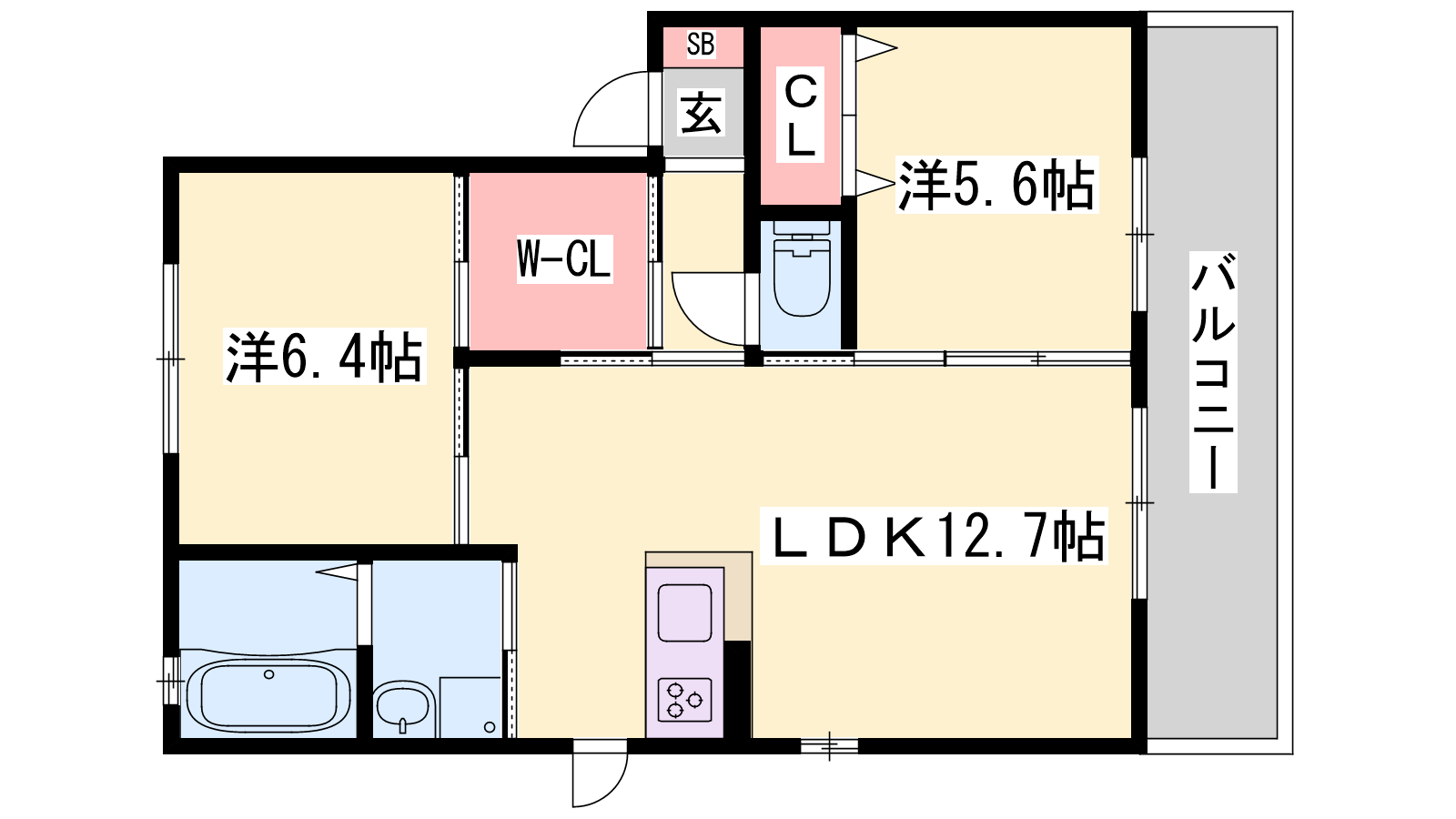- LDK12.7帖、洋室6.4帖、洋室5.6帖