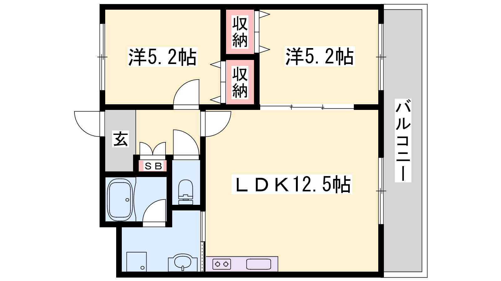 - LDK12.5帖、洋室5.2帖、洋室5.2帖