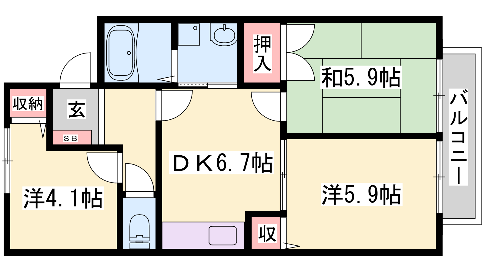 - DK6.7帖、洋室5.9帖、洋室5.9帖、和室4.1帖