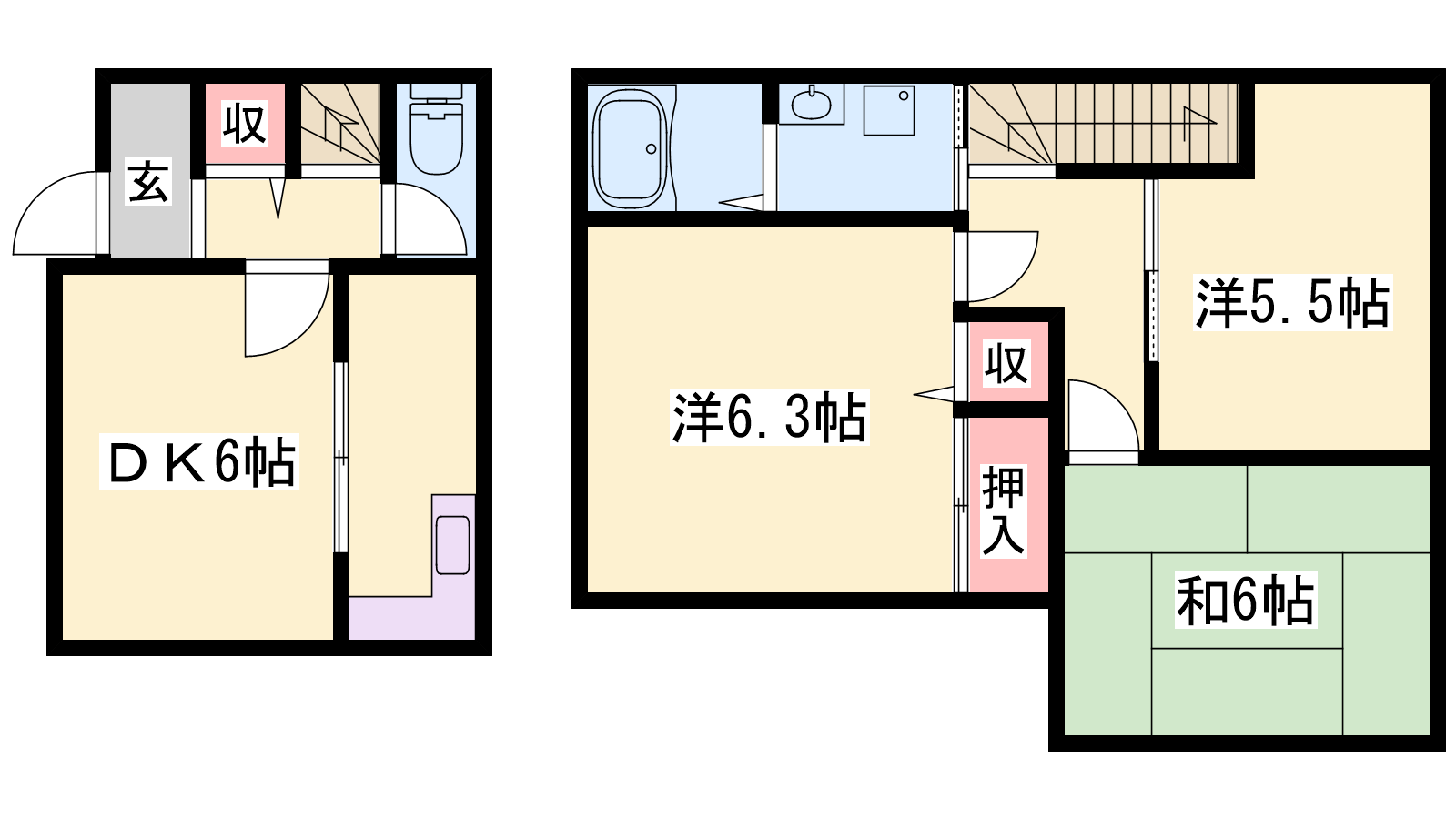 - DK6帖、洋室6.3帖、洋室5.5帖、和室6帖