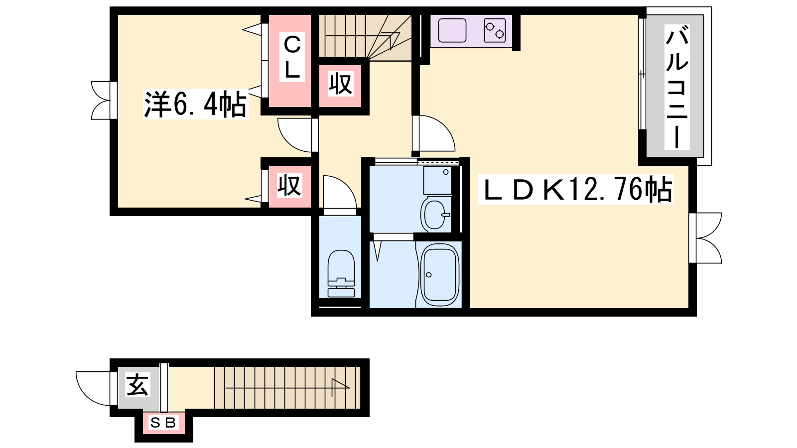 - LDK12.8帖、洋室6.4帖