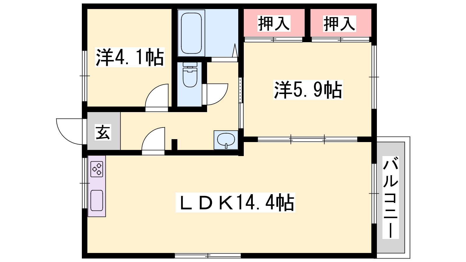 - LDK14.4帖、洋室5.9帖、洋室4.1帖