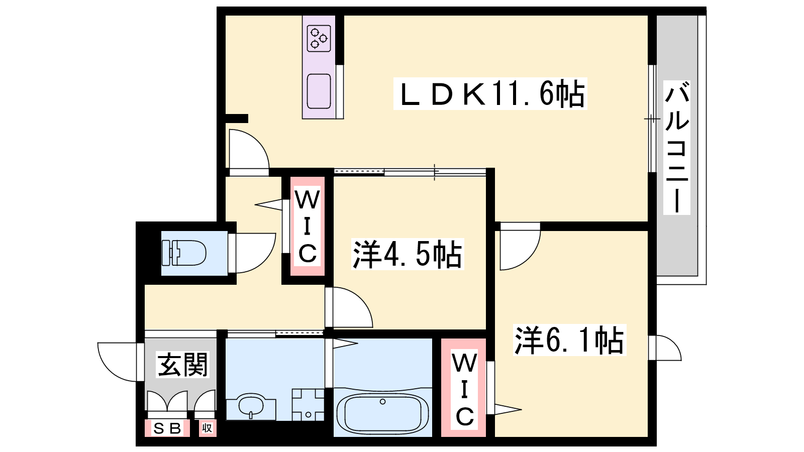 - LDK11.6帖、洋室6.12帖、洋室4.51帖