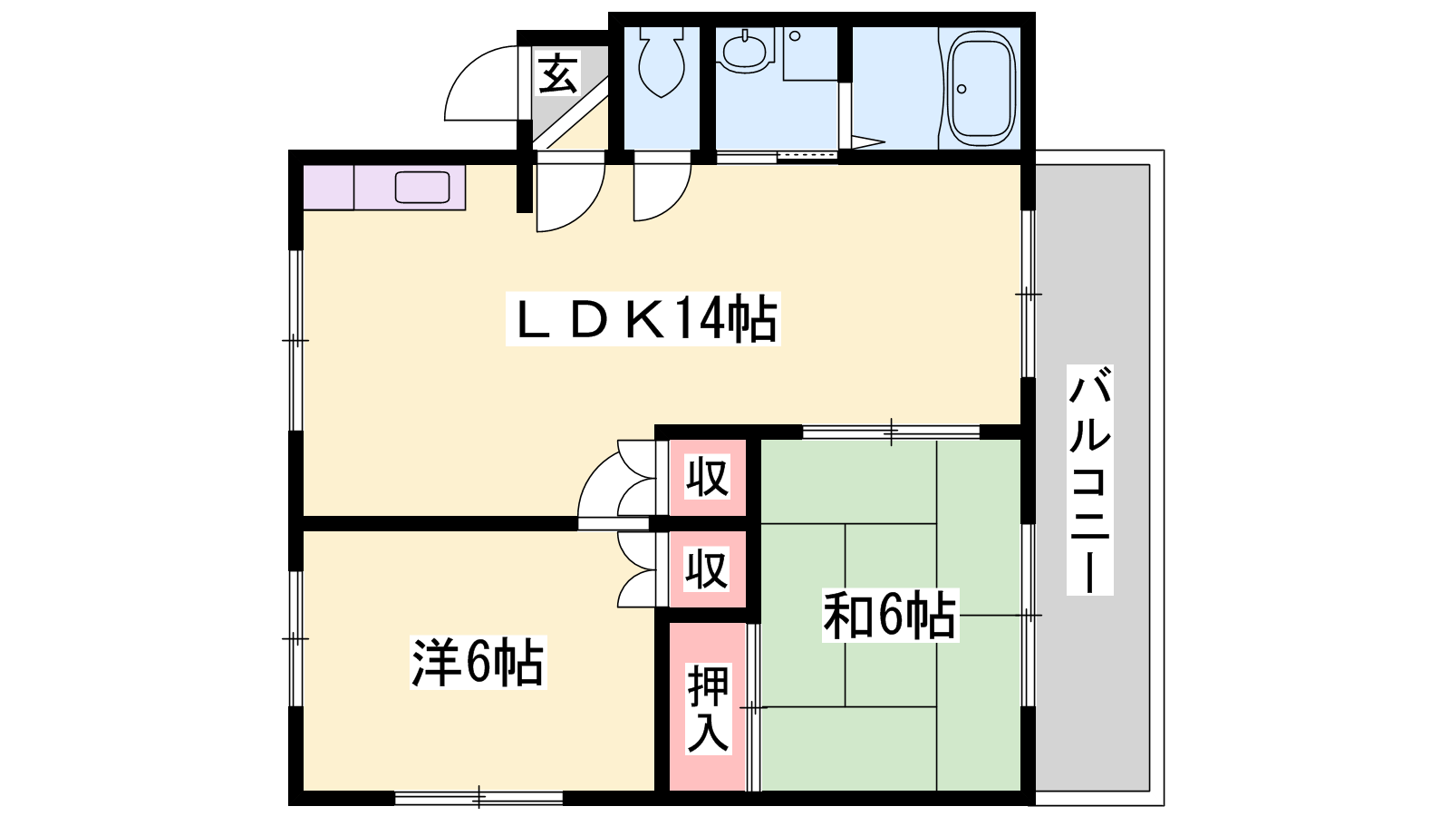 - LDK14帖、洋室6帖、和室6帖